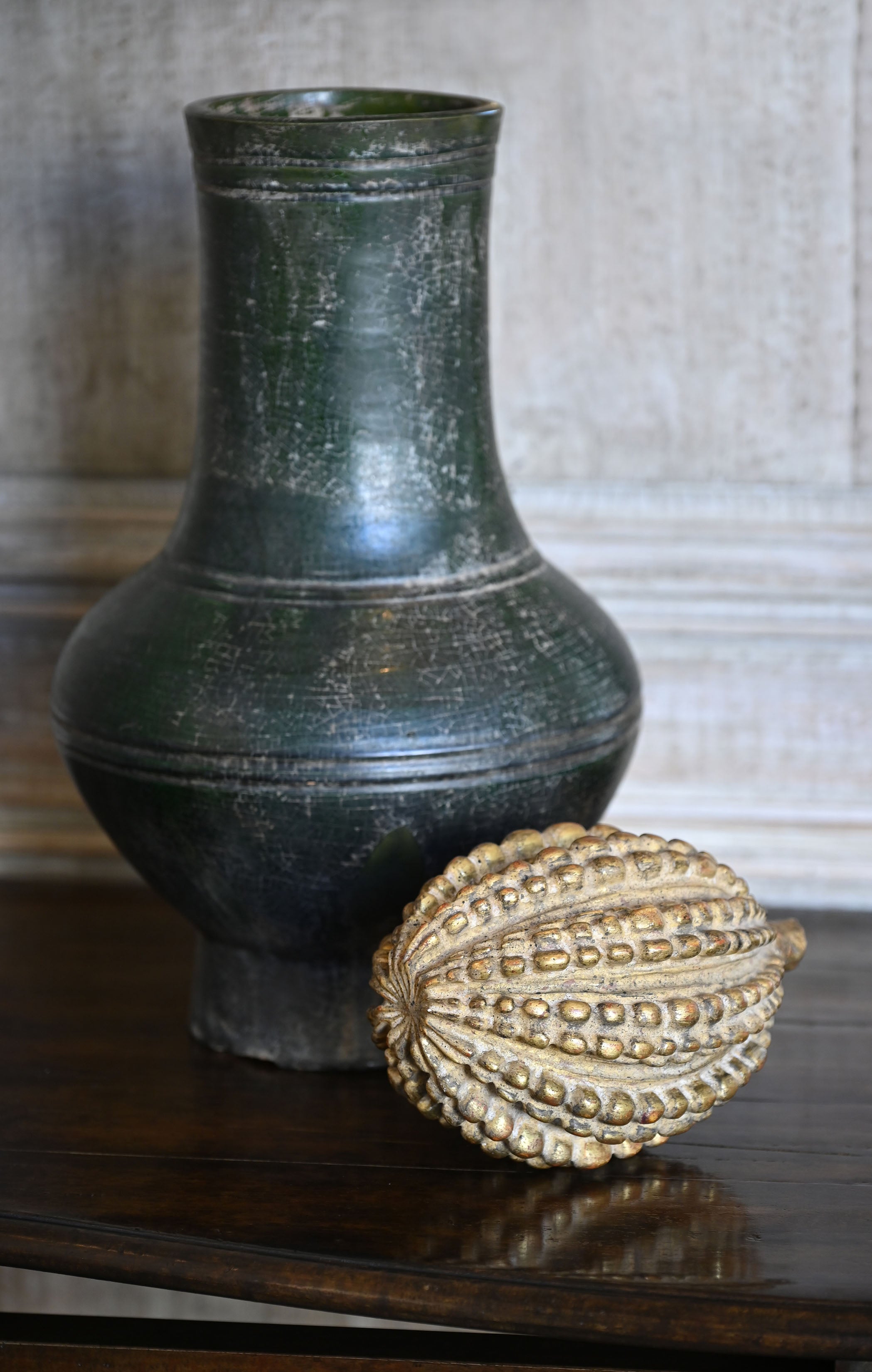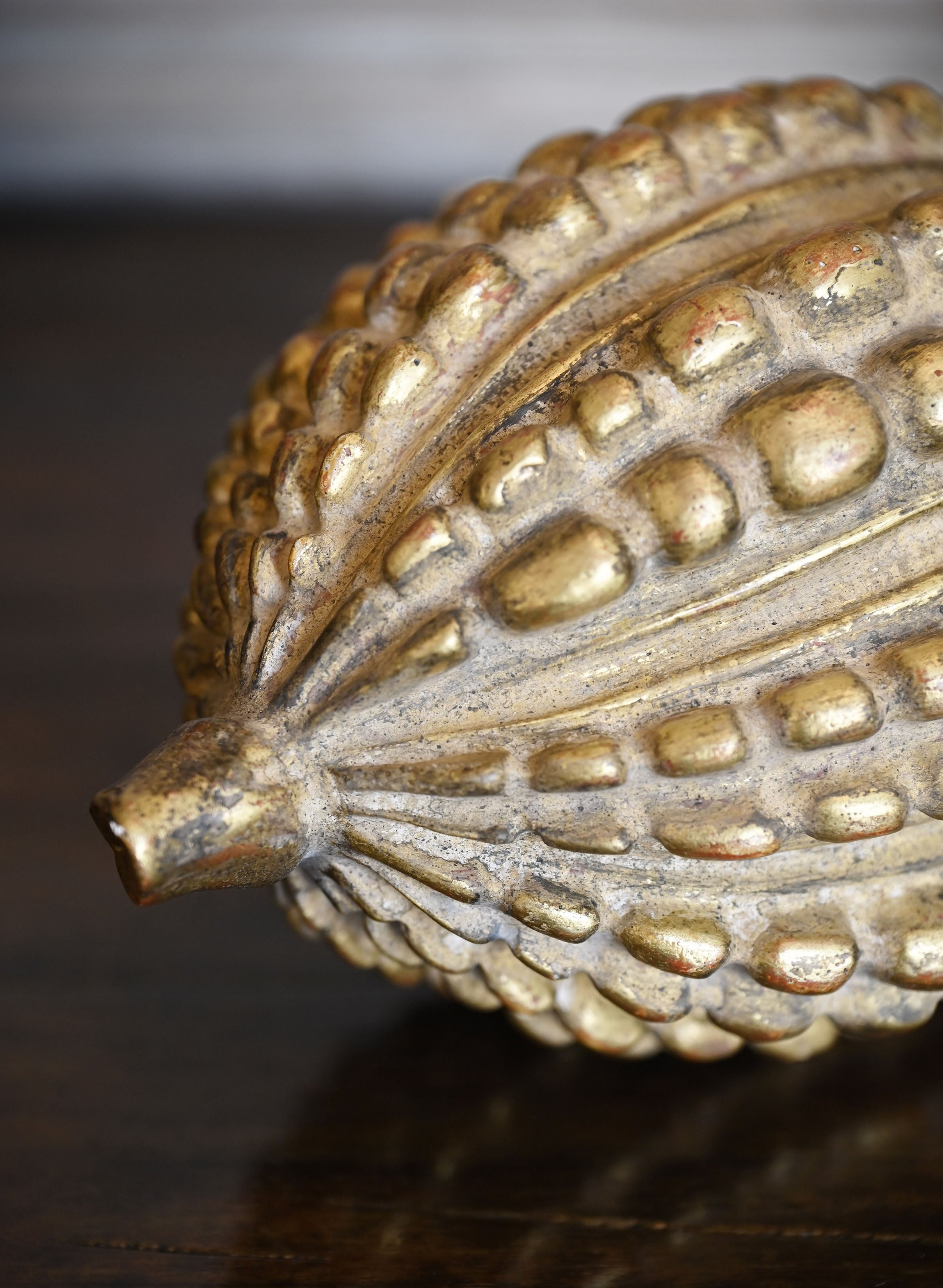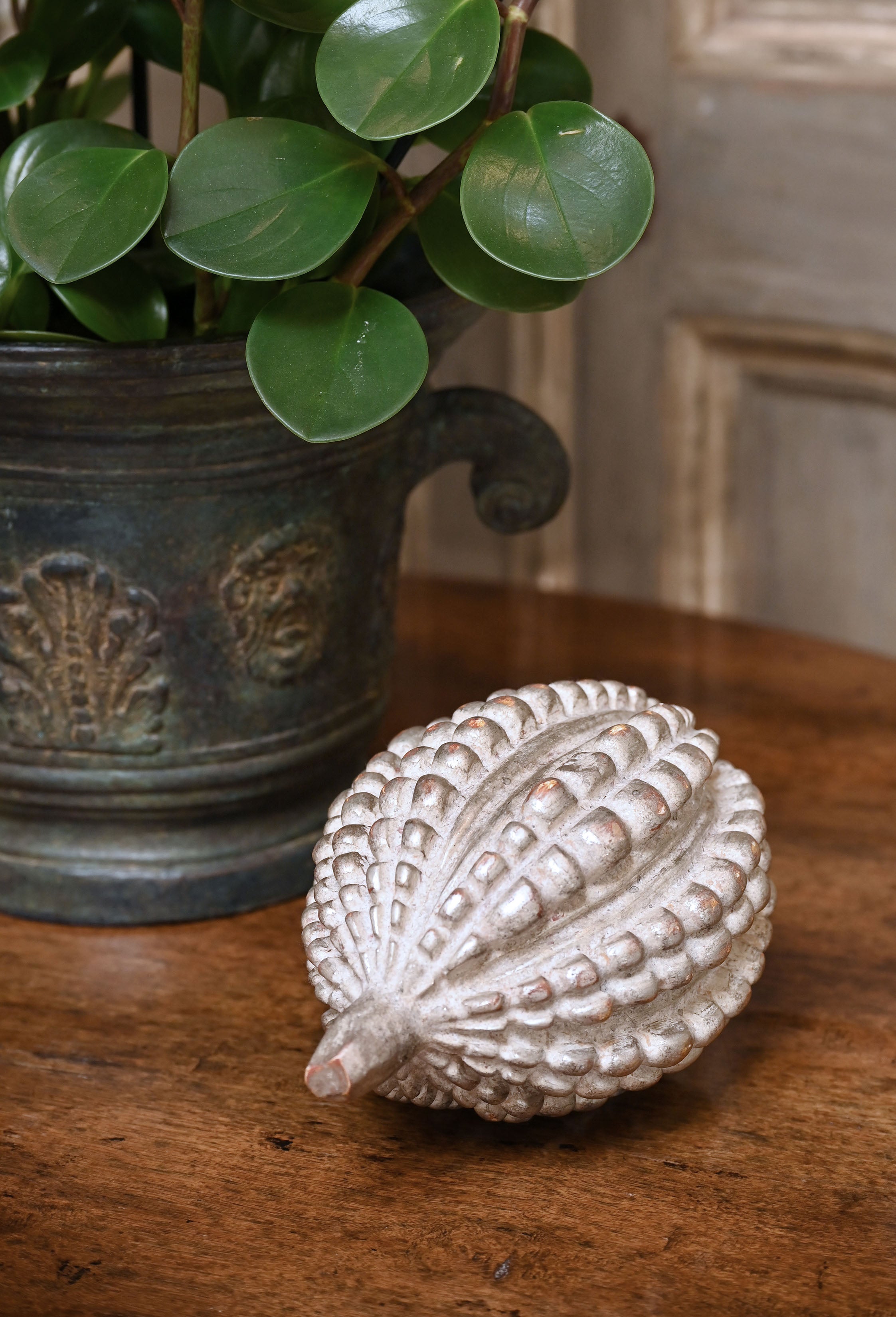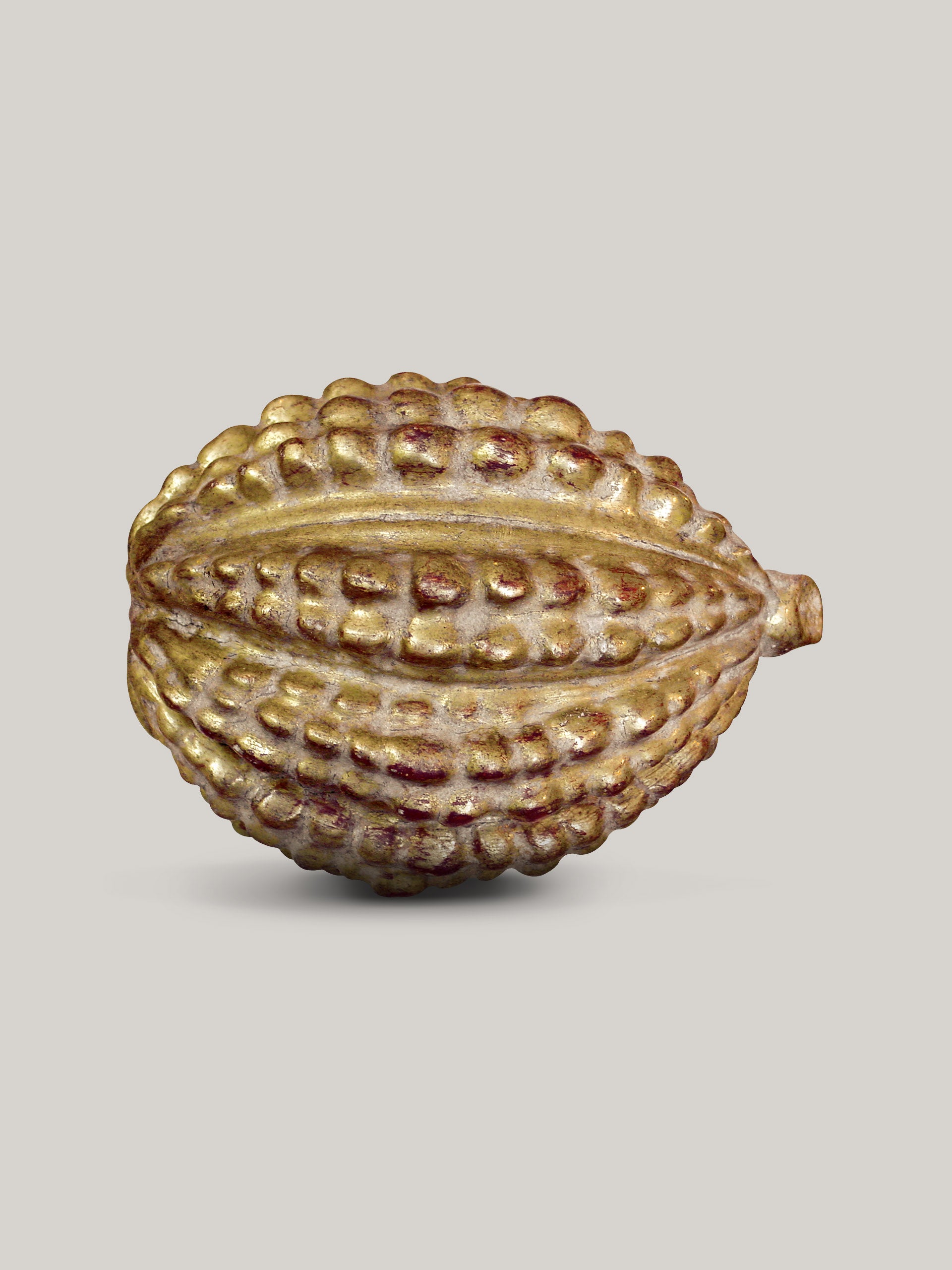 Inspired by the natural form of cacao pods, this sculptural decorative object showcases a richly textured surface finished in radiant gilt. Its organic silhouette brings warmth, depth, and visual intrigue to thoughtfully styled interiors. Offered in Antiqued White Gold or Antiqued 22k Gold finishes.