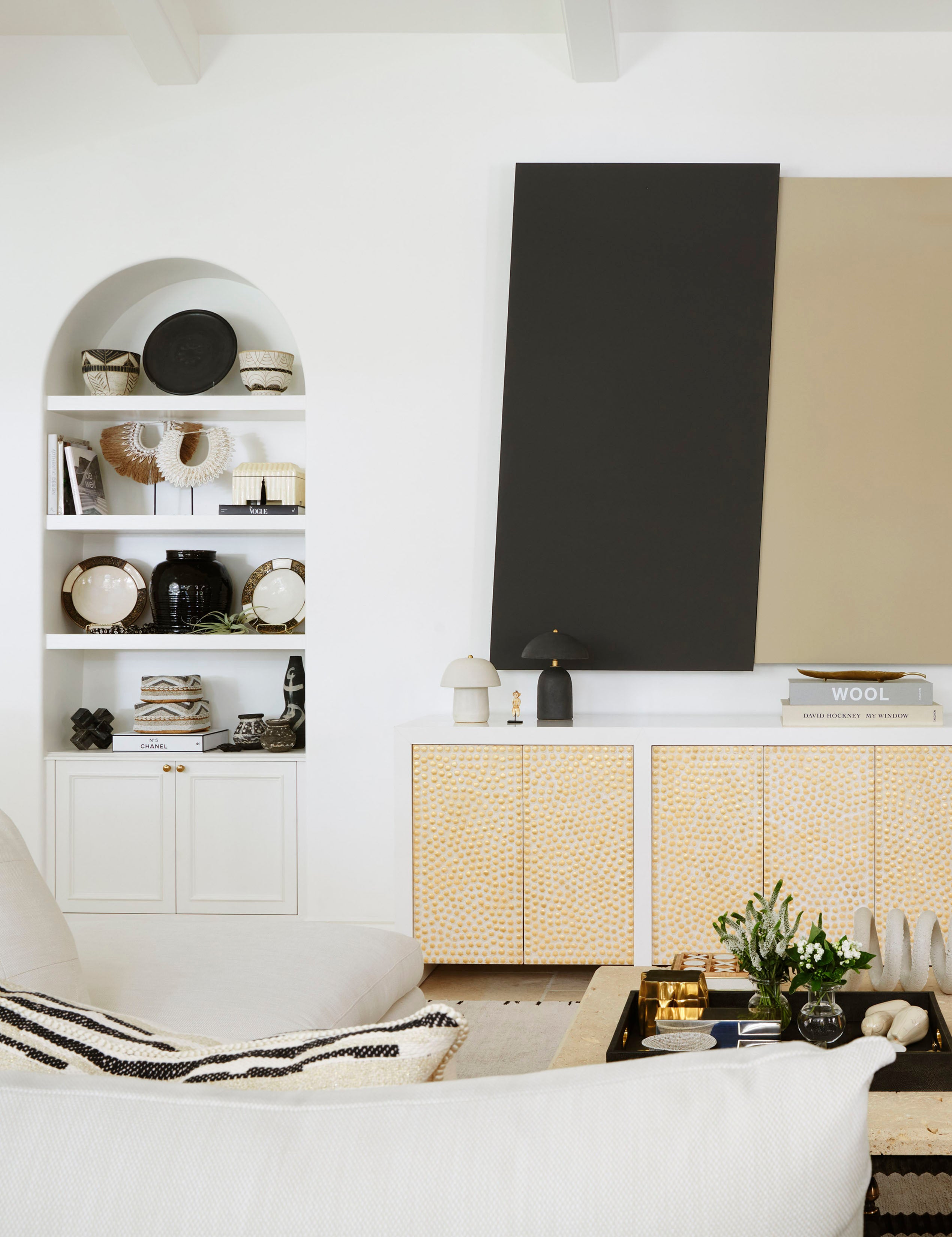 Defined by balance and measured form, the Sliding Scale functions as sculptural art within an interior. Its architectural geometry and refined material contrast—white gold gilt paired with matte-painted wood—create visual rhythm and quiet sophistication. Available in two sizes.