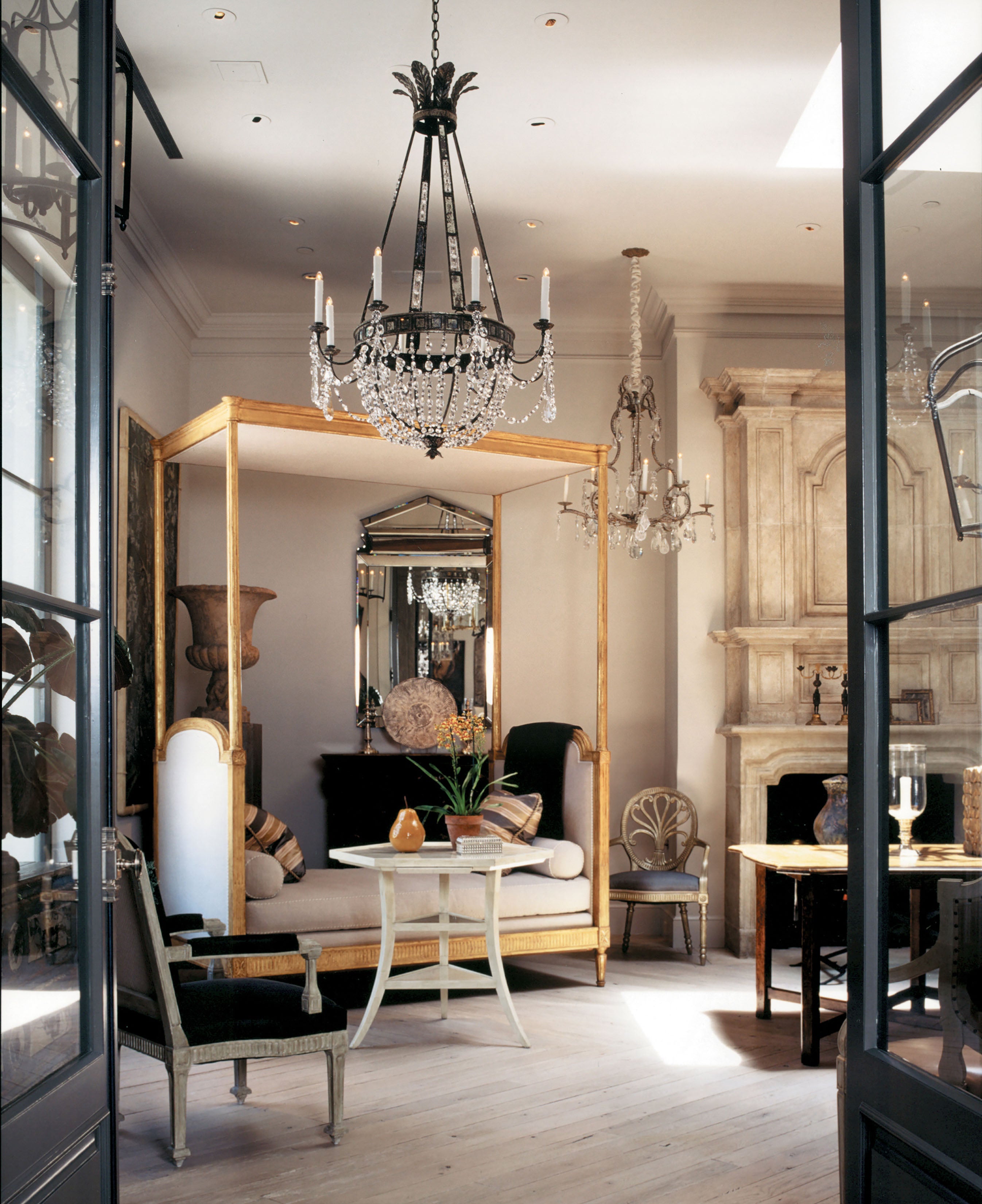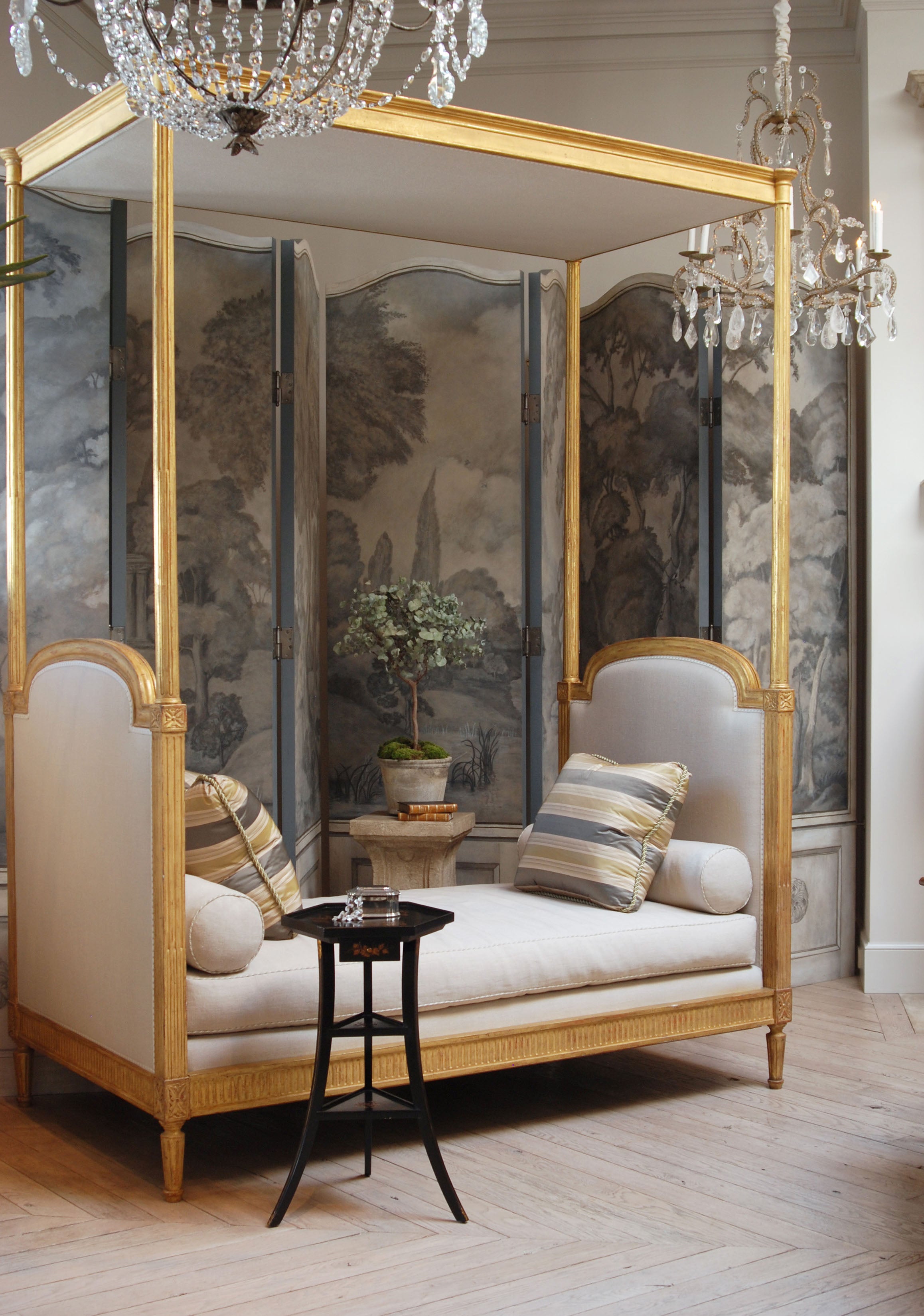 A vision of gilded indulgence, the Louis XVI Gilt Daybed invites leisurely repose beneath high ceilings and soft light. Its elegant frame and regal presence transform rest into ritual. Hand-finished in Antiqued 22k Gold Gilt, with upholstered headboard, footboard, and canopy. Available in four sizes.