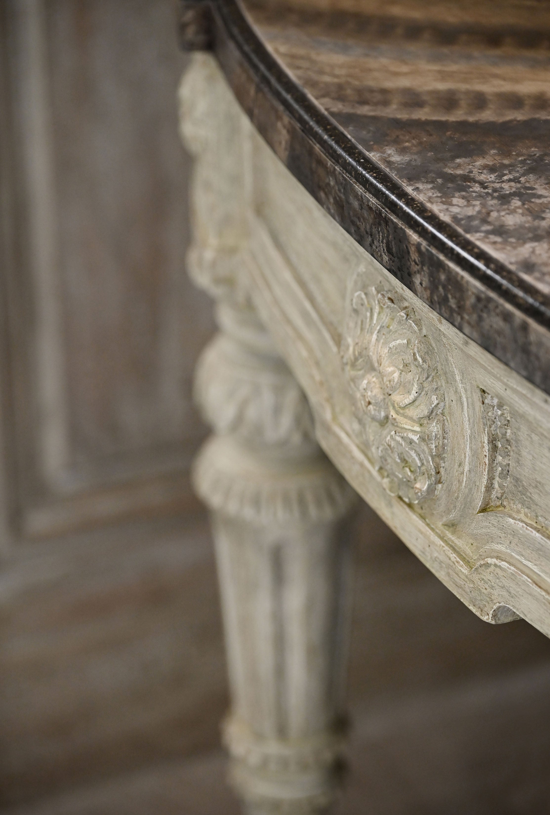 The Park Terrace Console features a hand-painted carved wood base paired with a hand-painted Faux Marble top. Its light, elegant structure brings a refined architectural presence to interior spaces.