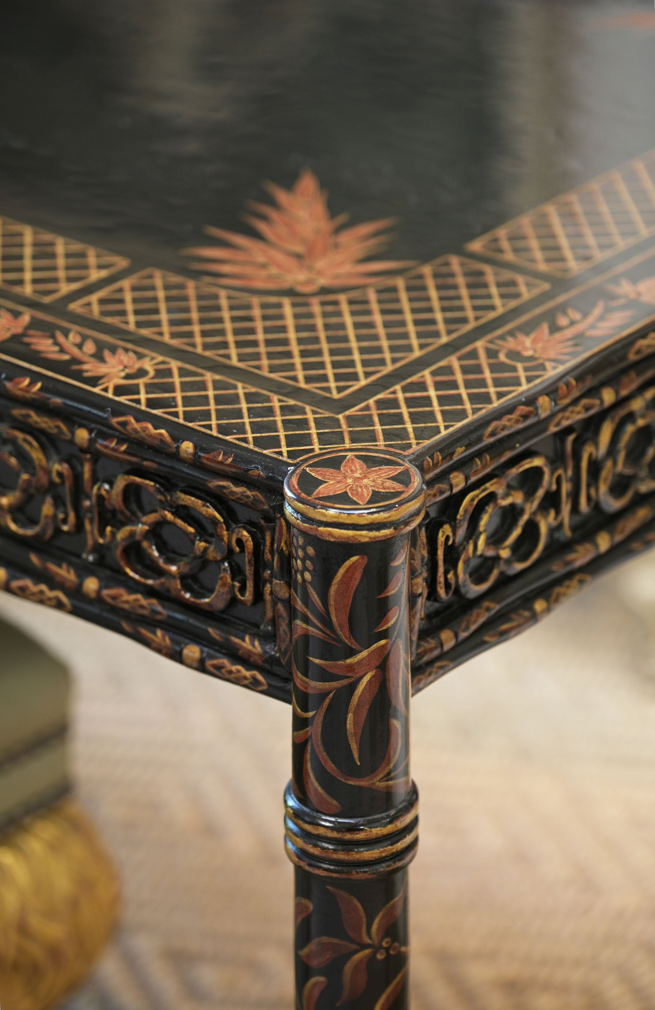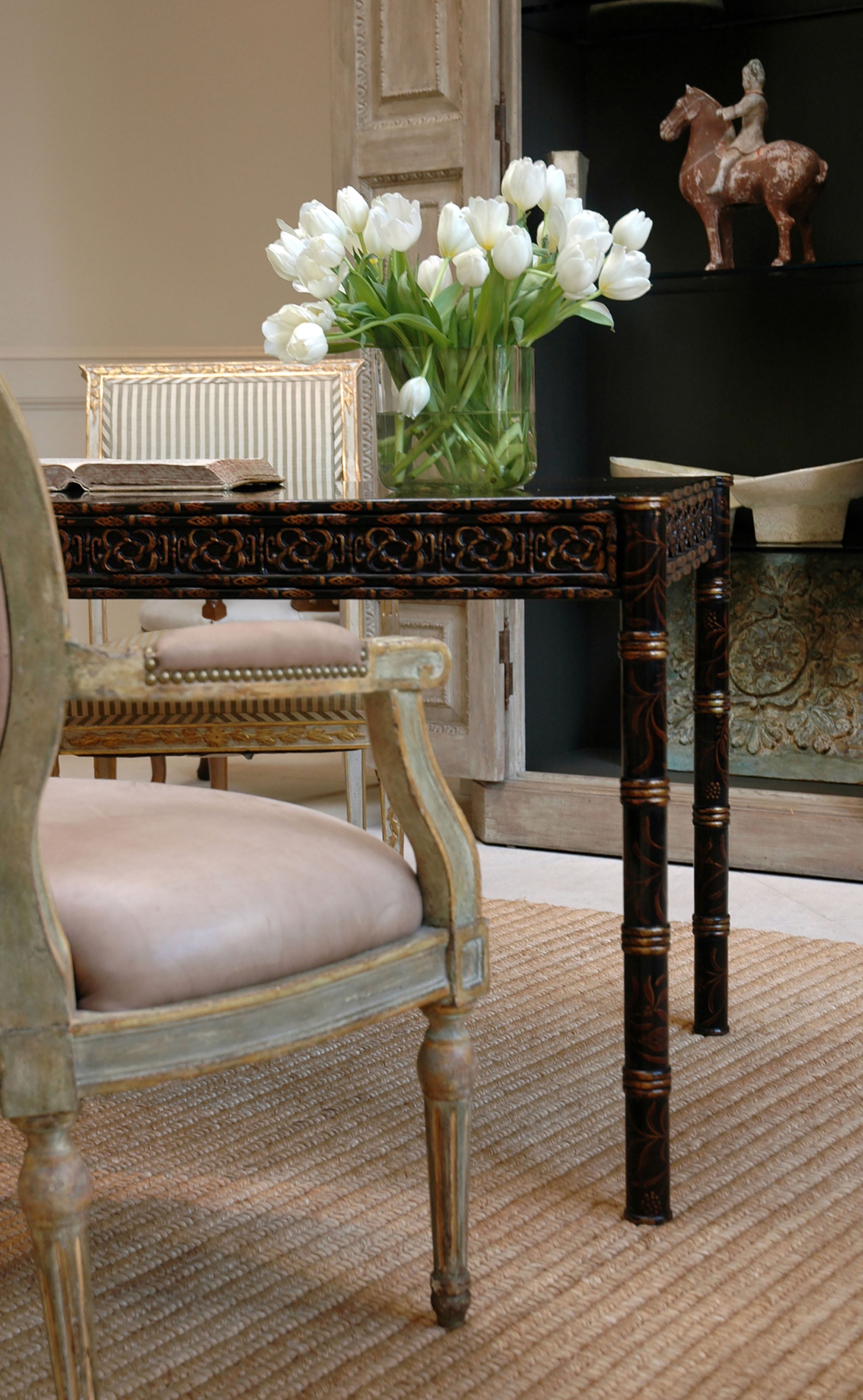 Polished to a lustrous sheen, the Regency Lacquer Desk is both functional and seductive. Its clean, architectural lines and reflective surface evoke a disciplined glamour—an objet designed for thought, intention, and legacy. Hand-painted in a deep Raisin crackled lacquer, the desk is enriched with an exquisite antiqued gilt Chinoiserie design, applied by hand with painterly precision. Three discreet drawers are seamlessly integrated, offering refined utility while preserving the desk’s elegant, uninterrupted silhouette.