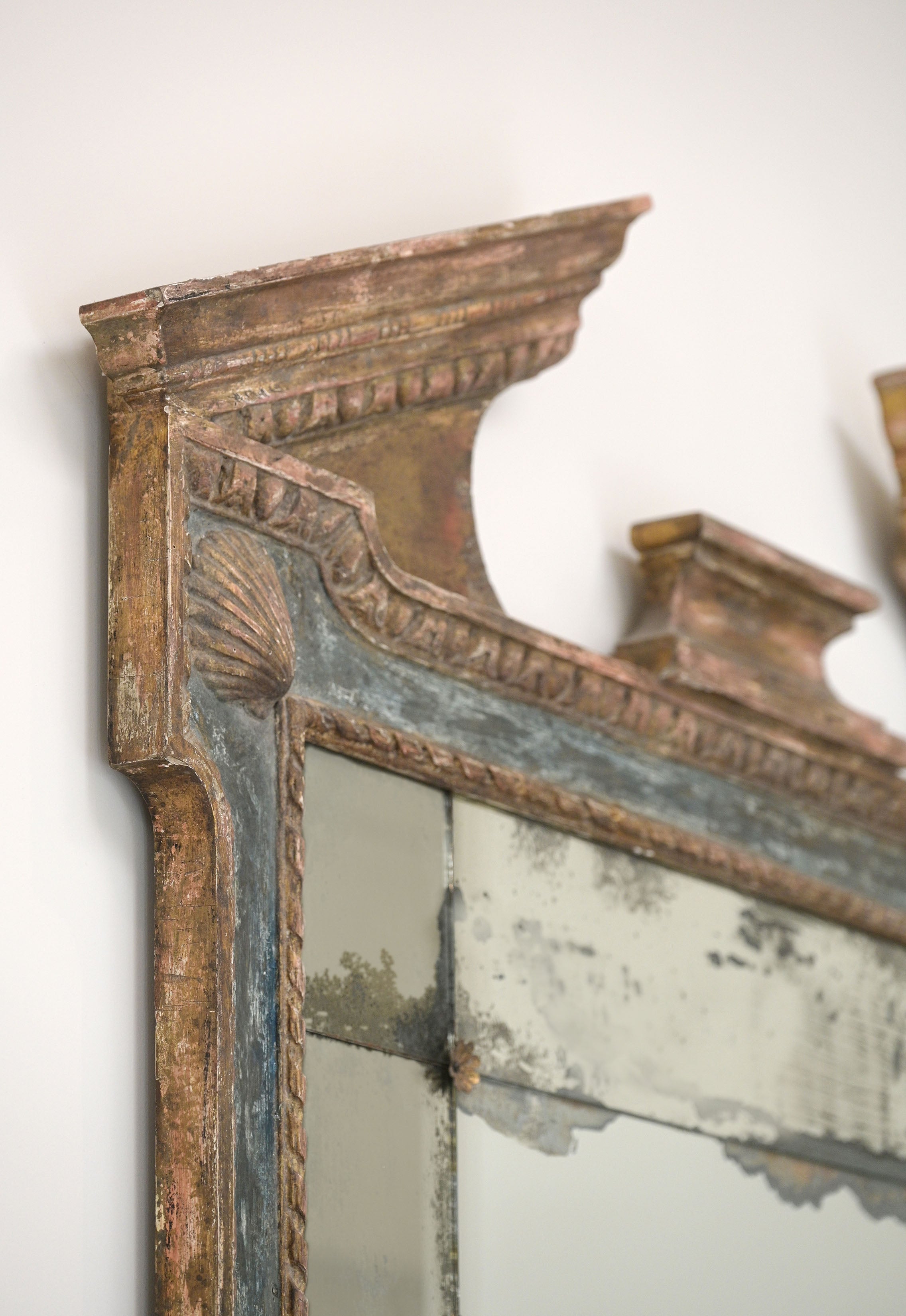 Defined by a dramatic broken pediment crown, this Georgian-style mirror commands attention with its stately proportions and classical detailing. The nine-piece mirror construction—offered in clear or antiqued glass and accented with decorative rosettes—adds depth, light, and architectural presence. Available in small or large.