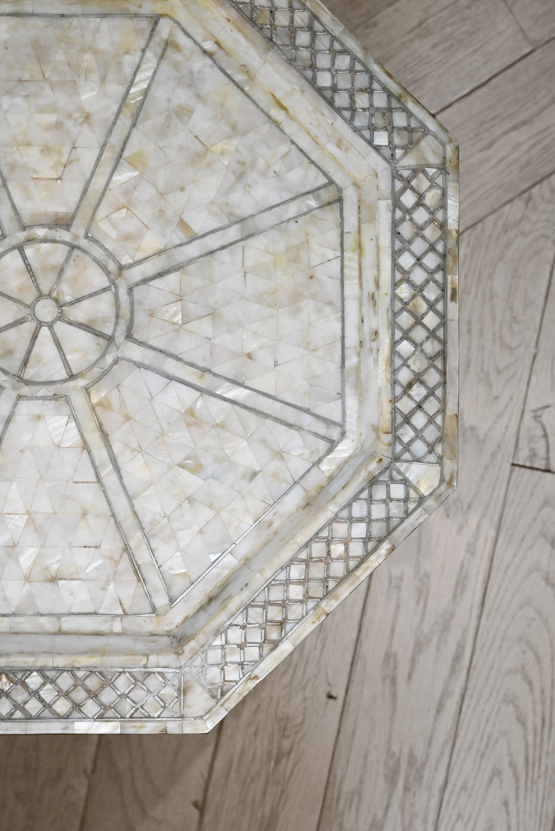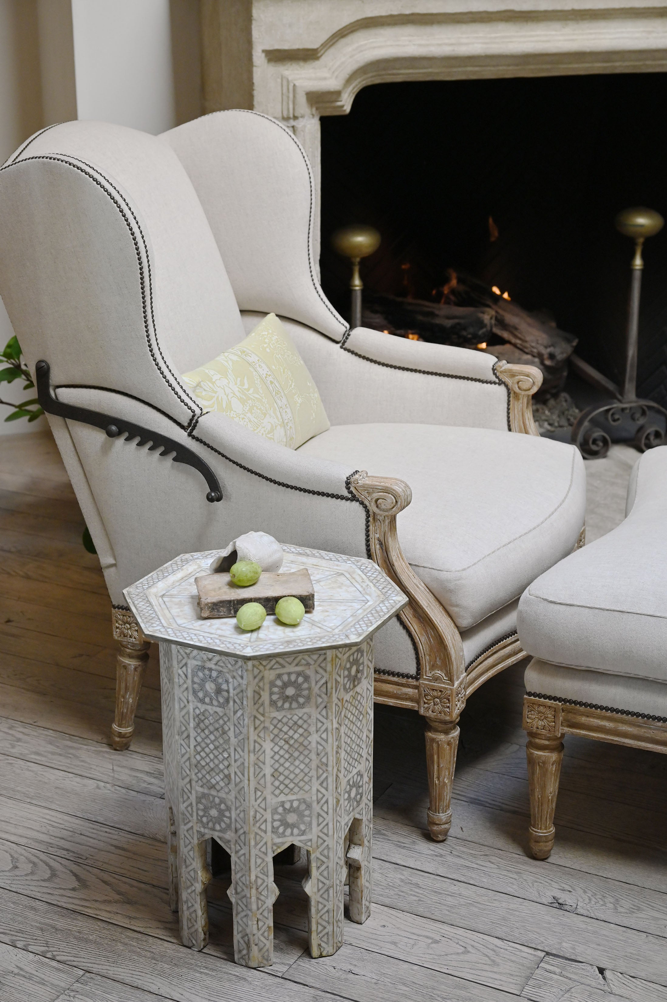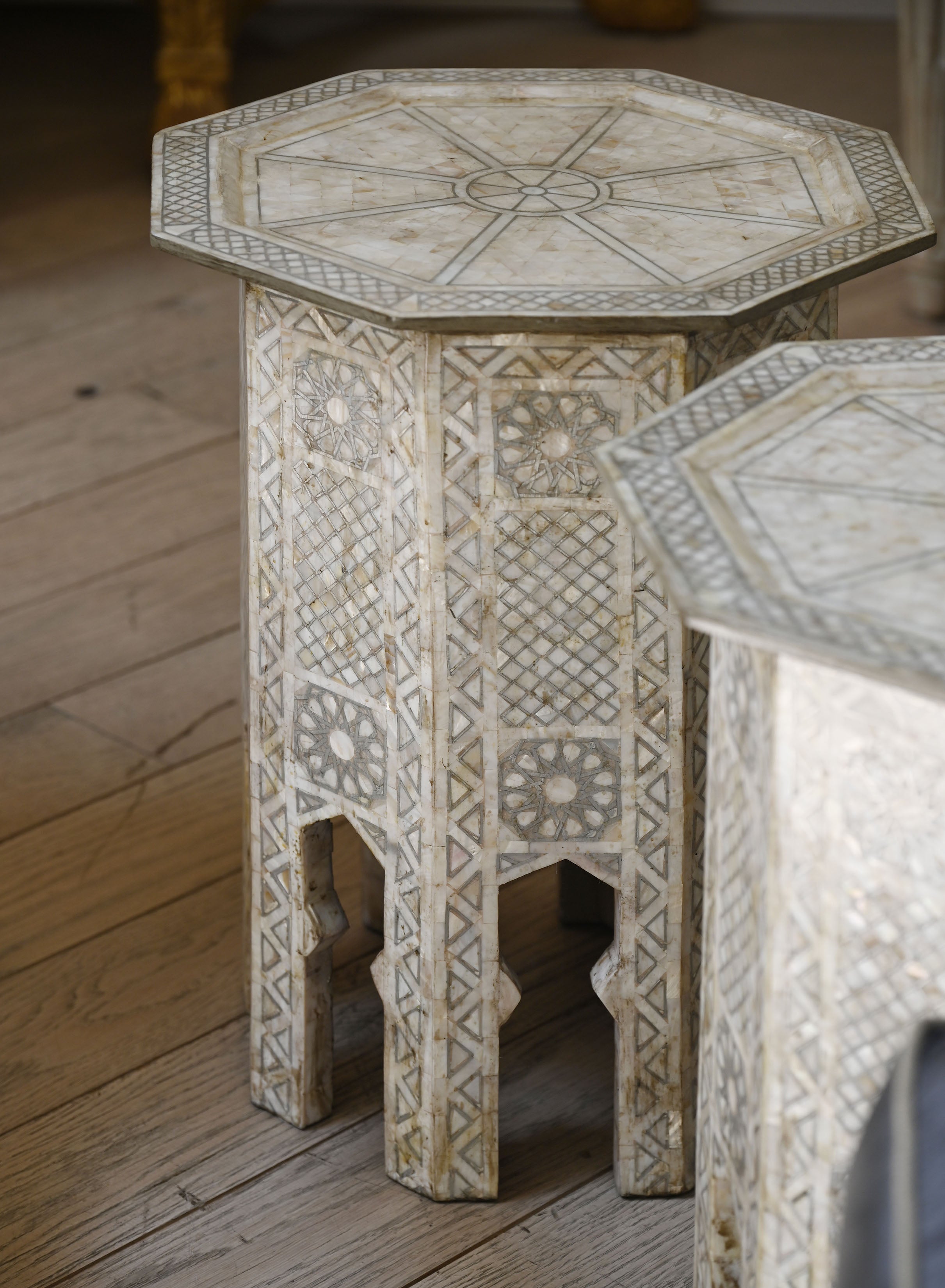 The Aziza Side Table is defined by its architectural silhouette and refined Mother of Pearl surface. Finished in a softly aged palette, this sculptural piece brings depth and character to any setting, serving equally well as a functional table or a decorative statement.
