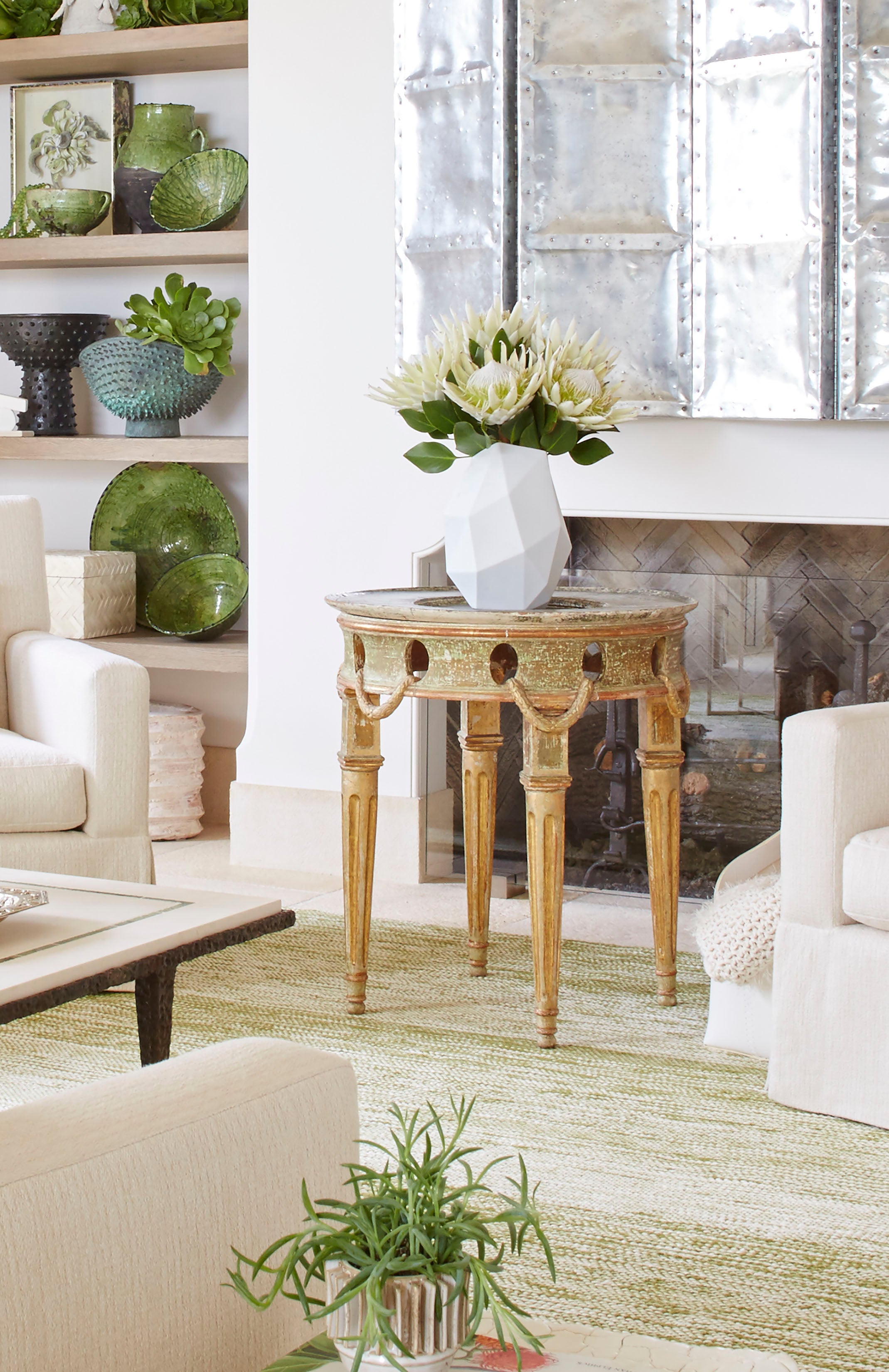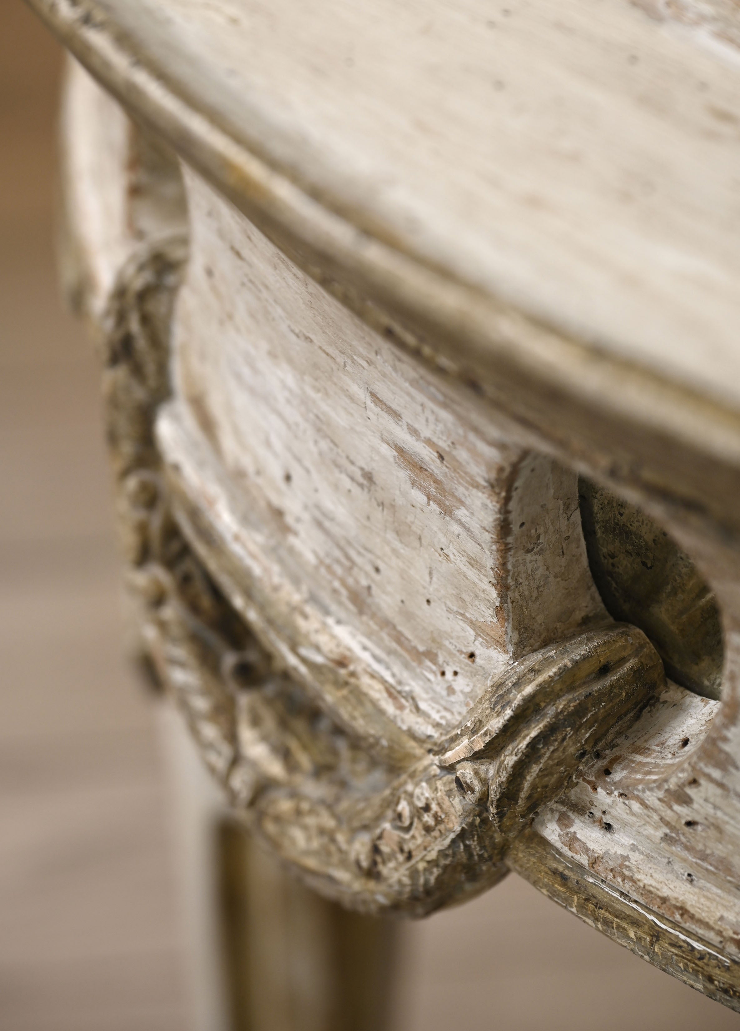 This refined side table draws inspiration from neoclassical design, featuring elegant tapered legs and delicately carved swags that lend sculptural rhythm to its silhouette. Finished in a softly aged palette of muted white and warm patina, the surface reveals subtle wear that enhances its sense of history and craftsmanship.