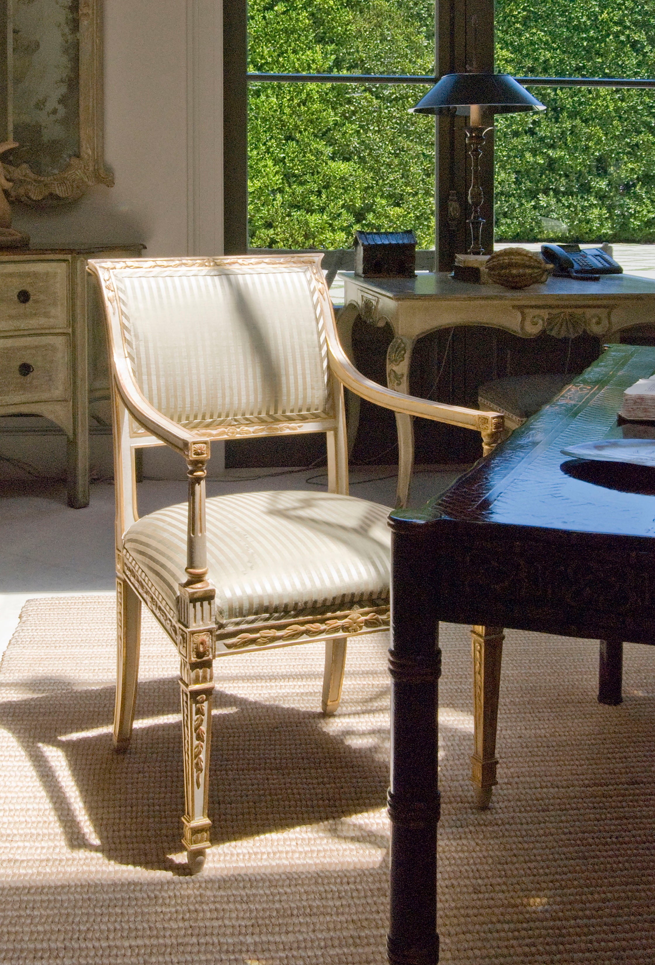 The Evan Chair is defined by its balanced proportions and tailored design. Crafted with attention to detail and hand-applied Antiqued White gold and 22k Gold details, it offers refined comfort and versatility, making it an elegant addition to living spaces, bedrooms, or studies.