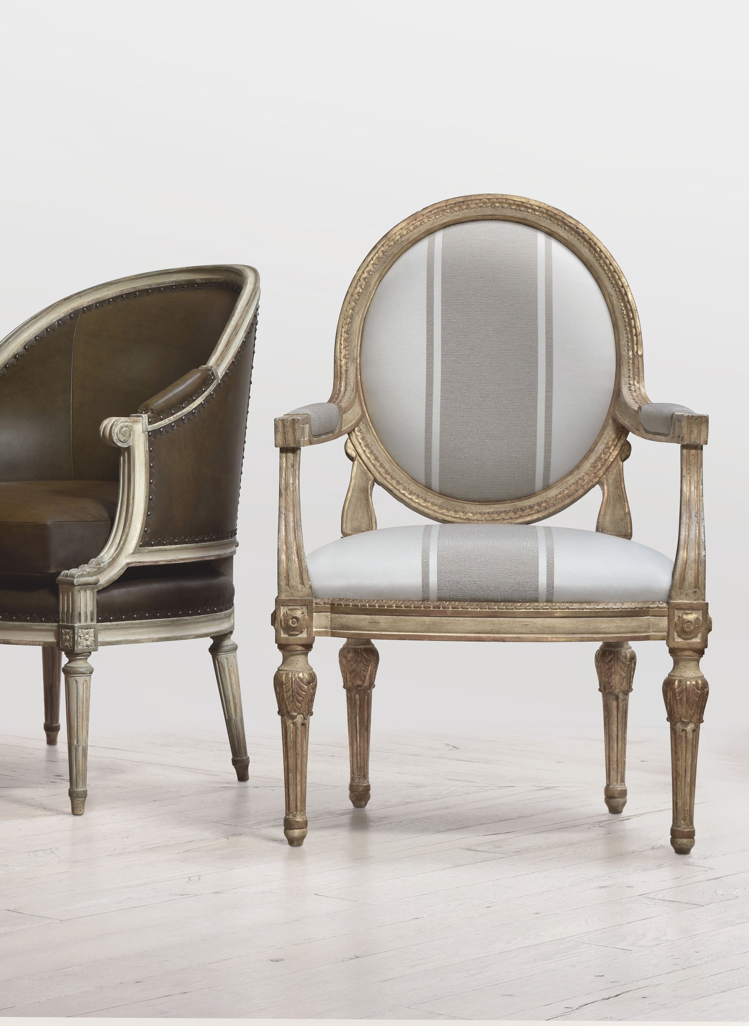 This armchair embodies the symmetry and refinement of Louis XVI design, featuring straight lines, fluted details, 22k Gold finish and elegant carving. A timeless piece that brings formal grace to dining or living spaces.
