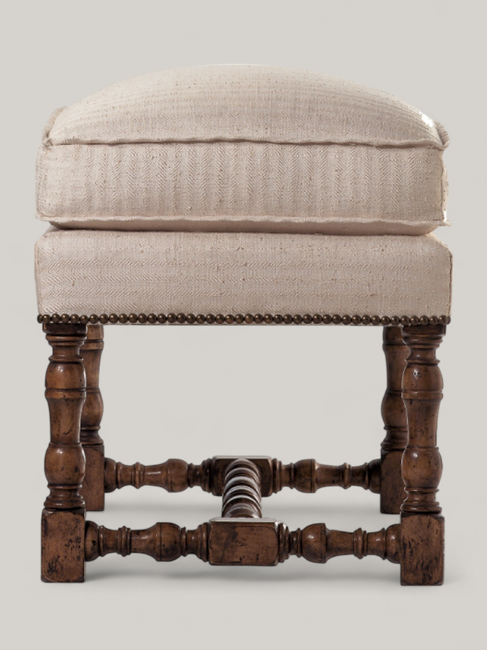 Low and inviting, the Louis XIII Fireside Ottoman offers a moment of repose with historical charm. Its compact form and refined upholstery make it a perfect companion to the Fireside Wing Chair, encouraging relaxed luxury in intimate settings.