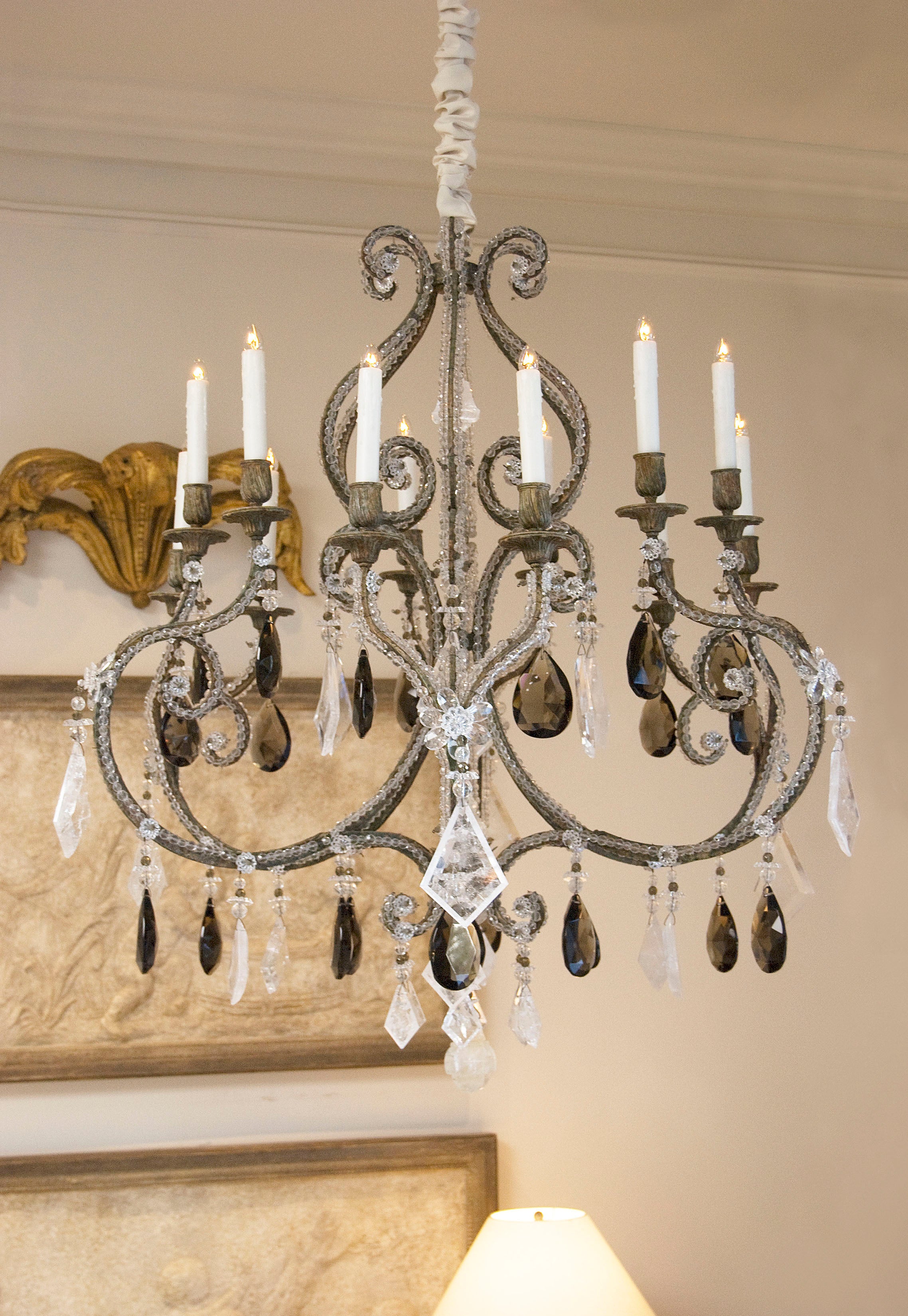 Opulent and dramatic, the Russian Chandelier is a symphony of shadow and light. Its cascading form and intricate detailing evoke grand salons and candlelit evenings, where illumination was both spectacle and ceremony. Crafted with a hand-forged and hand-painted iron frame, the piece offers a refined choice of adornment: Lead Crystal trim with smokey lead crystals for a moody, Old World glow, or partial Rock Crystal trim paired with smokey lead crystals, introducing a luminous contrast that heightens its theatrical presence.