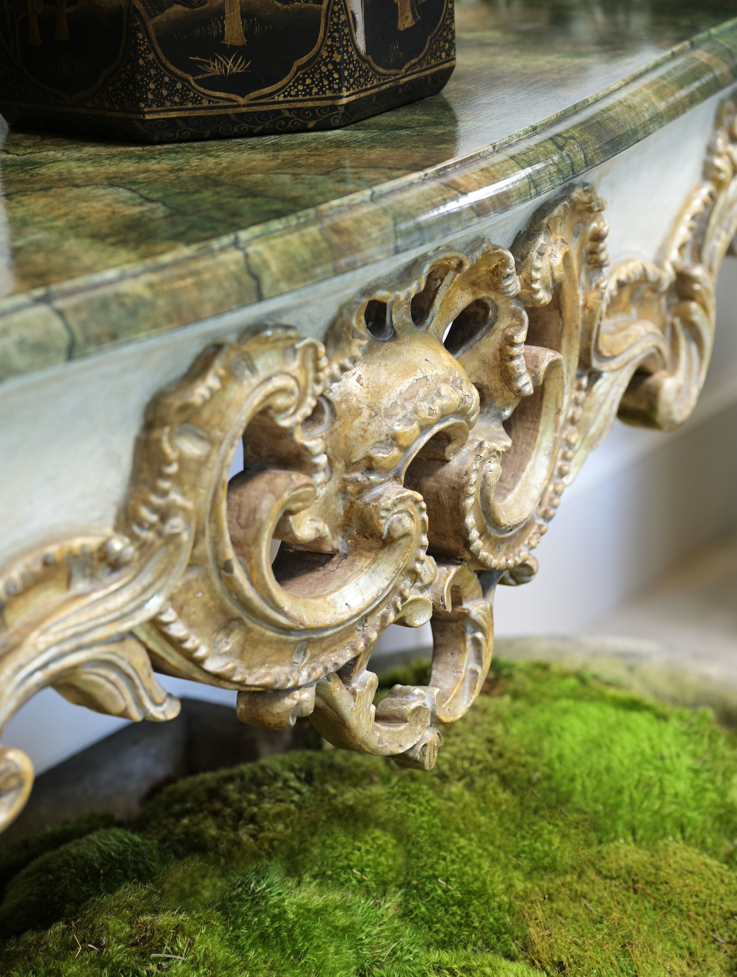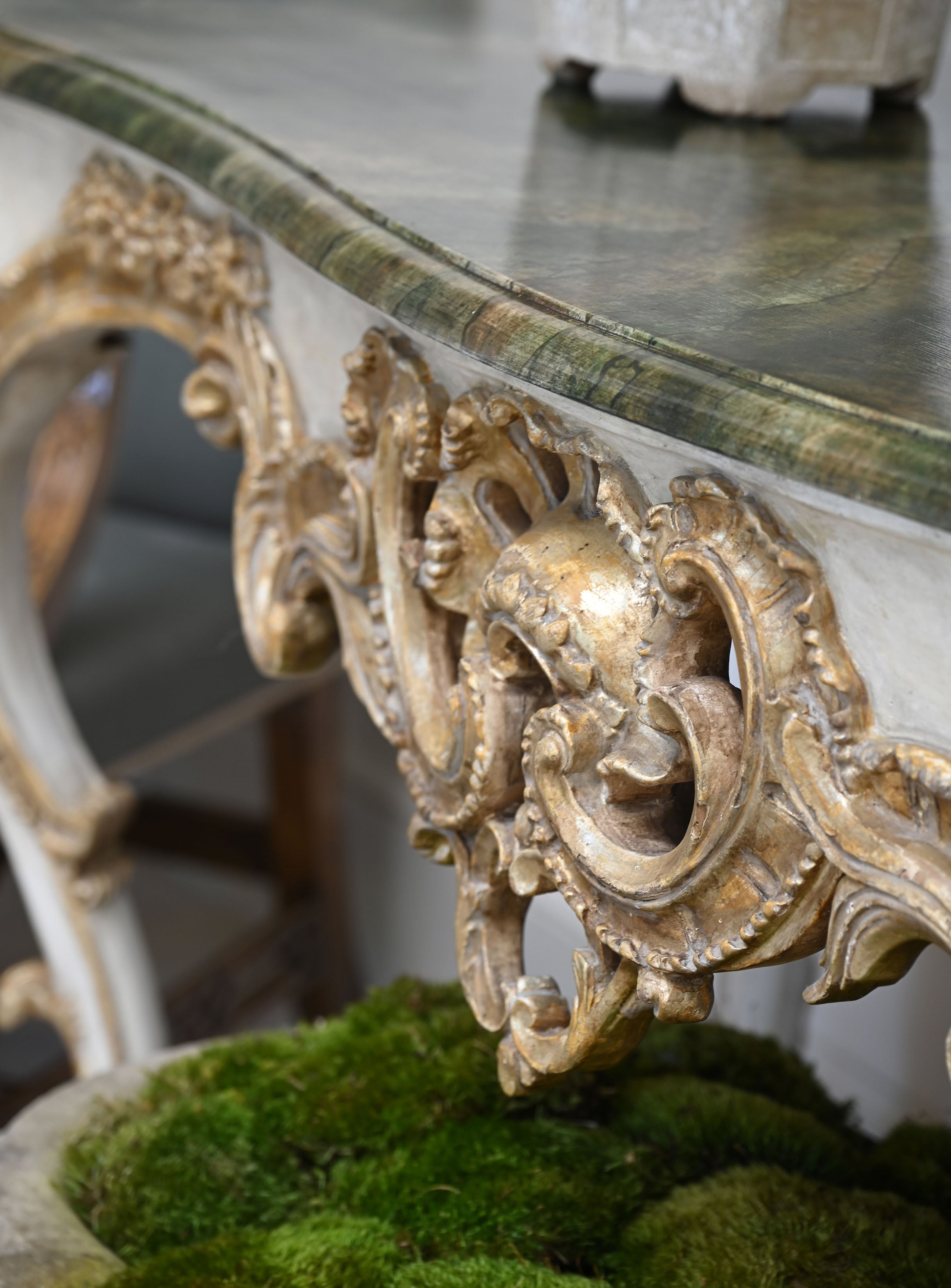 The Valerian Console is unapologetically dramatic. Ornamental yet grounded, its sculptural presence is anchored by a detailed wood base adorned with heavily antiqued white gold accents, lending depth and timeworn elegance. Above, a painted faux marble top evokes classical stone, offering the beauty of marble through an artisanal lens.