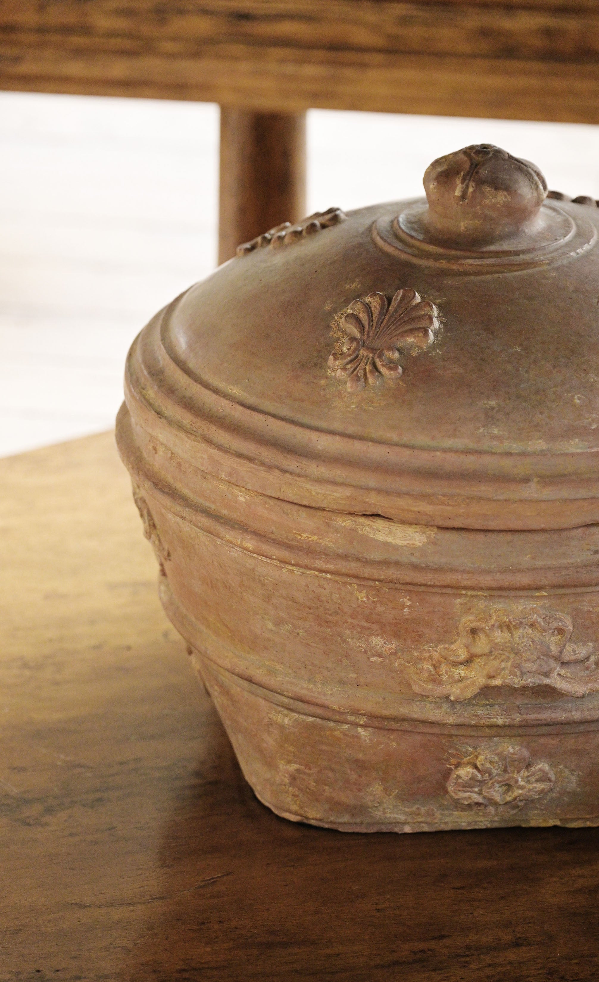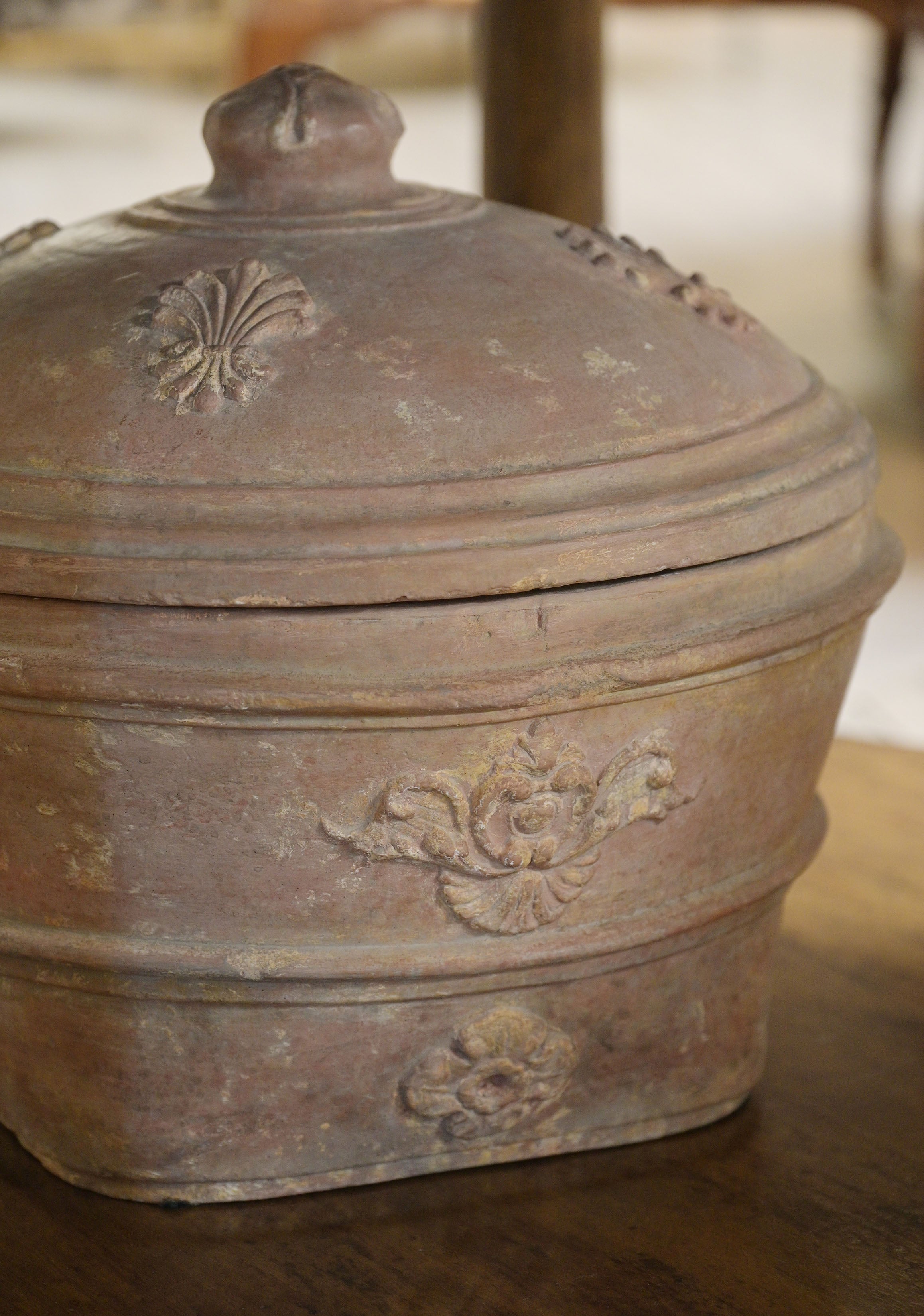 This elegant covered tureen features a refined silhouette and timeless form. The cast stone display piece with a hand-applied Terracotta finish brings classical charm and sophistication to tabletops.