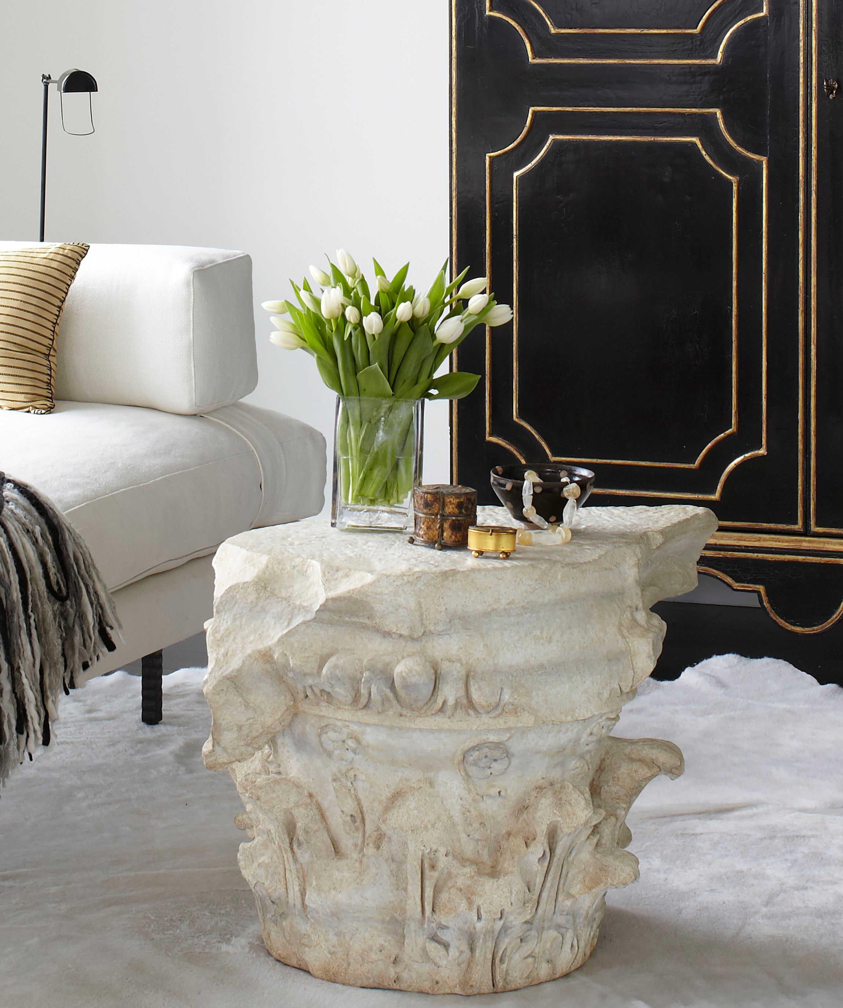 Inspired by classical architectural fragments, this sculptural cast stone table features rich texture, organic contours, and a beautifully weathered finish. Durable yet artful, it functions as either a side table or coffee table, bringing timeless character and architectural depth to any interior.