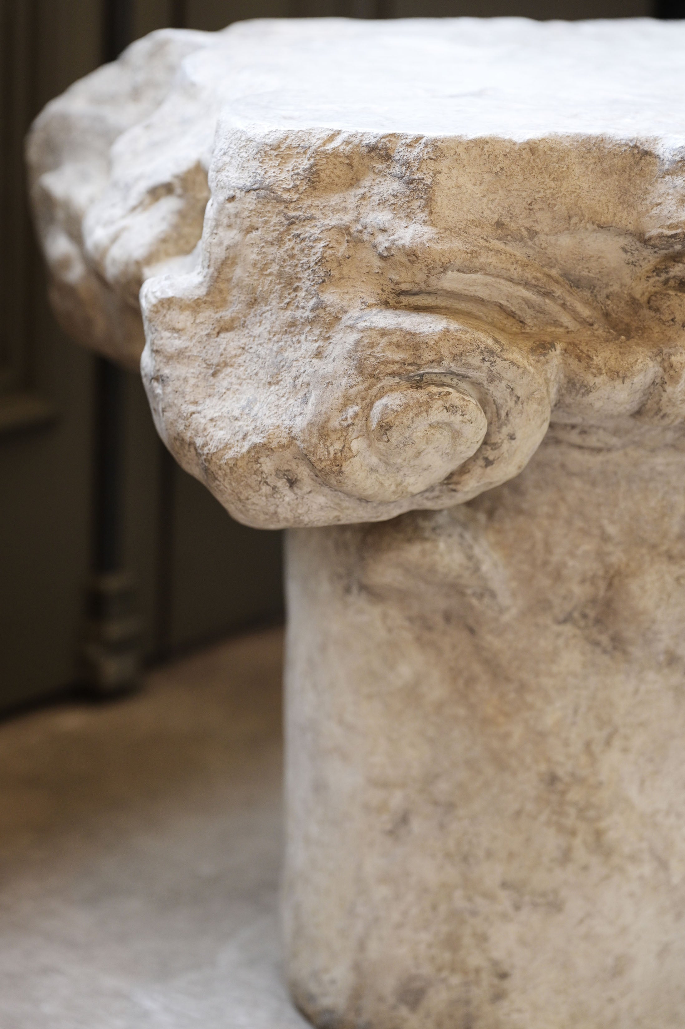 Drawing inspiration from classical architectural capitals, this cast stone side table offers sculptural presence and refined detailing. A distinctive accent piece, it adds depth and character beside seating or as a standalone statement.