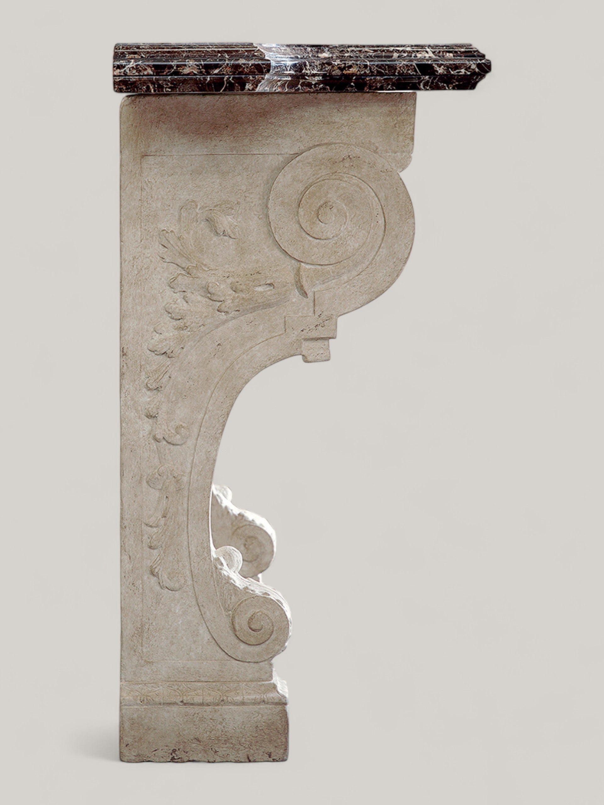 Inspired by classical Roman architecture, the Hadrian Wall Console features strong linear elements and sculptural cast stone supports. Designed to mount elegantly against the wall, it serves as both architectural ornament and a refined display surface, finished with Emperador Dark Marble.