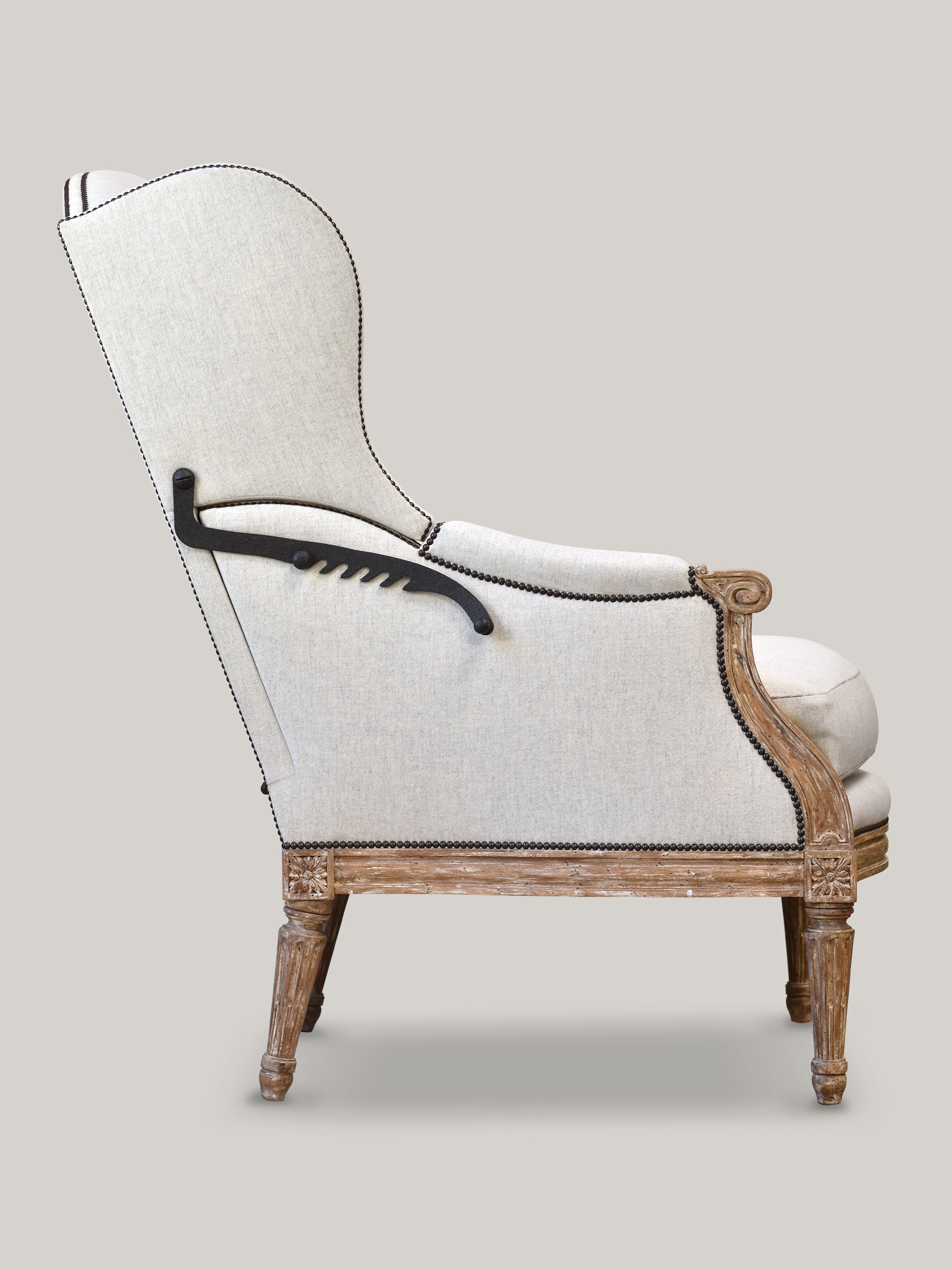 The Bentley Adjustable Lounge Chair combines tailored comfort with refined craftsmanship. Its adjustable form adds a striking architectural detail and allows for personalized relaxation, while its composed silhouette and fine upholstery make it an elegant addition to bedrooms, libraries, or sitting rooms. Hand-applied Eagle finish. Ottoman also available.