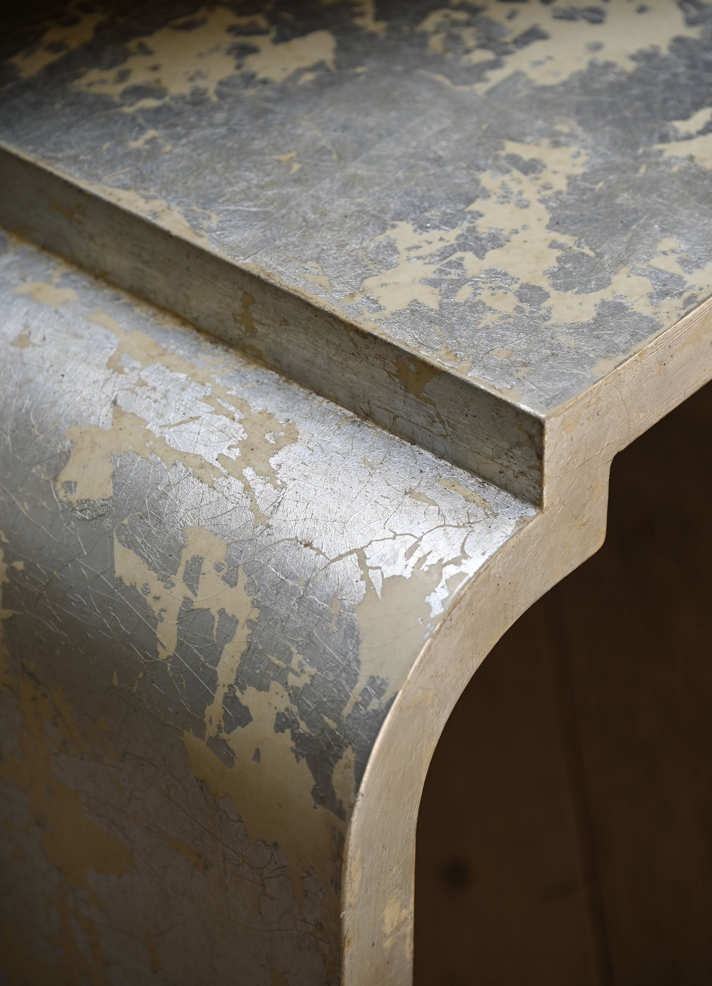 Shimmering with contemporary allure, the Modern Silver Leaf Table glows like moonlight across water. Its reflective surface catches and releases light, lending spaces a quiet drama that feels at once modern and timeless.