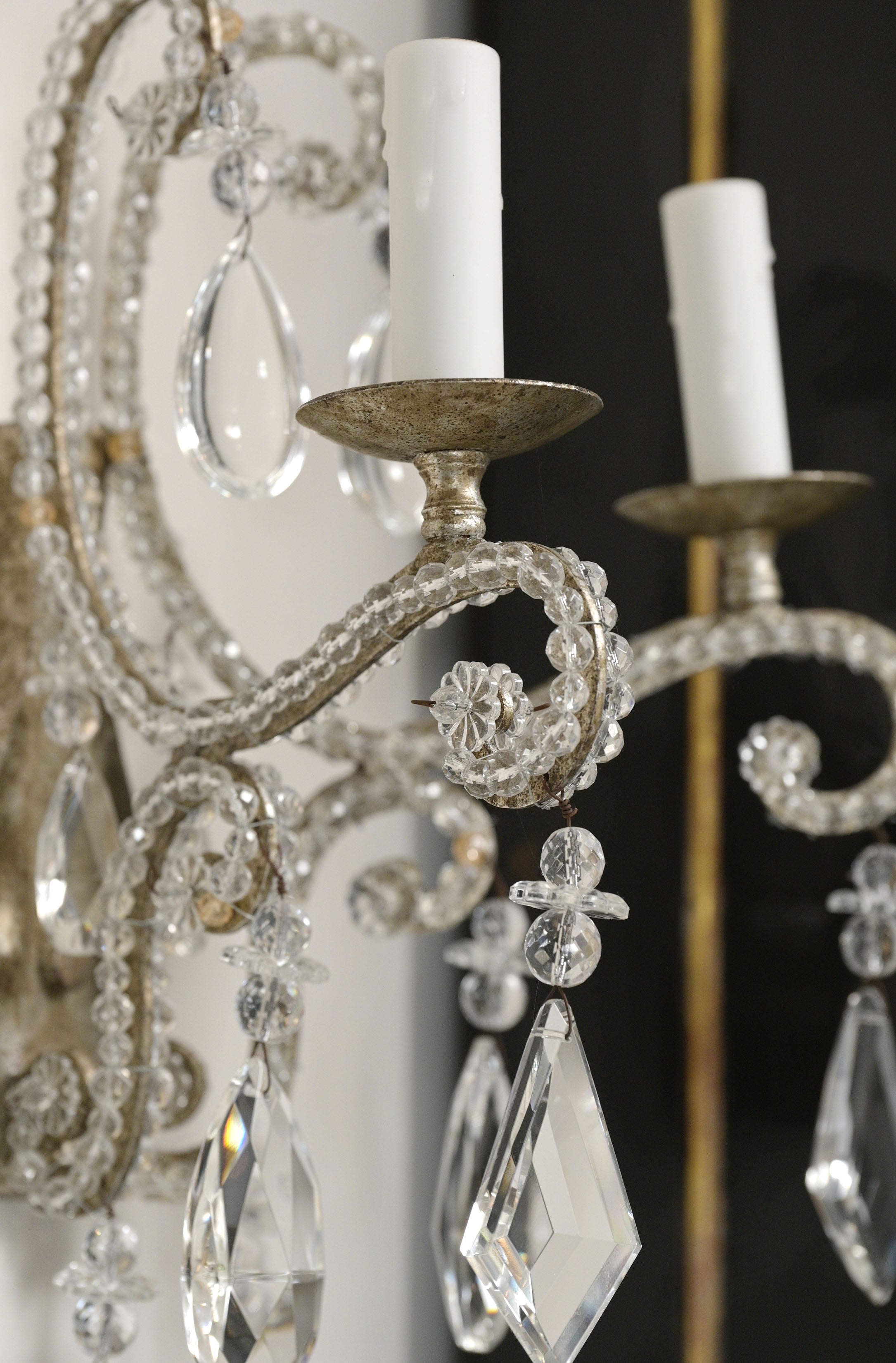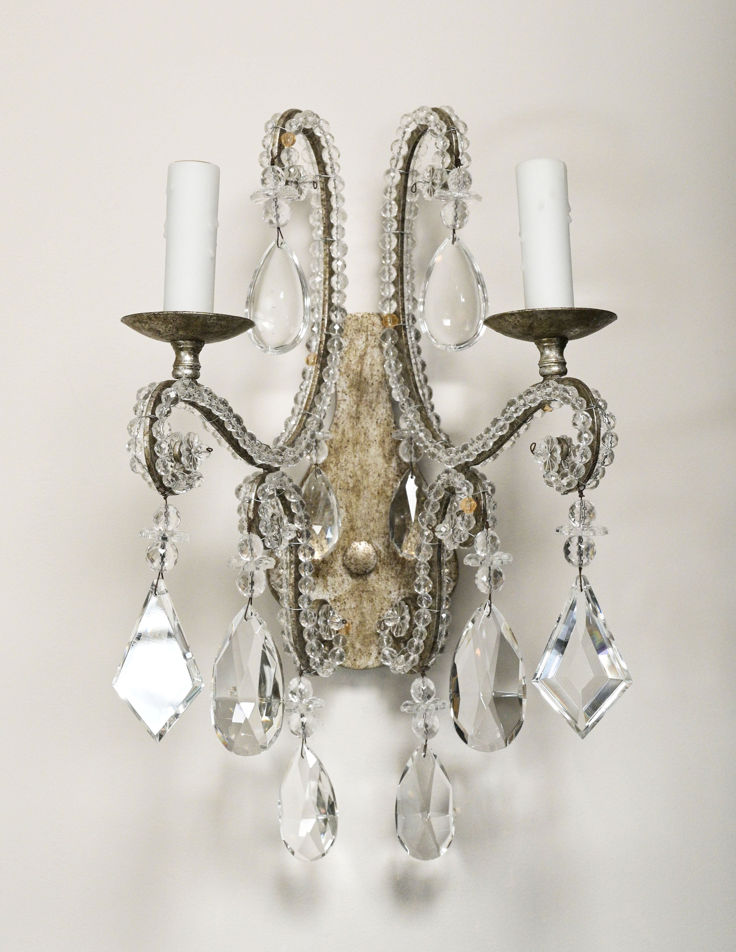 The Powder Room Wall Sconce offers a soft, flattering glow with refined detailing that enhances walls with understated elegance. Crafted from hand-forged iron with a hand-applied antique silver leaf finish and lead crystal beading.